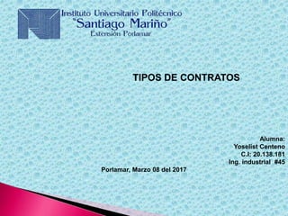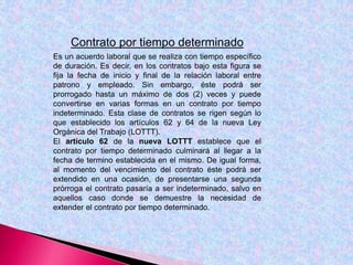 Este documento resume tres tipos principales de contratos laborales según la Ley Orgánica del Trabajo de Venezuela: 1) Contrato por tiempo determinado, el cual especifica una fecha de inicio y finalización aunque puede ser prorrogado dos veces; 2) Contrato por tiempo indeterminado, que no tiene fecha de culminación establecida; 3) Contrato para una obra determinada, el cual estipula el servicio que prestará el trabajador para completar una obra en particular.