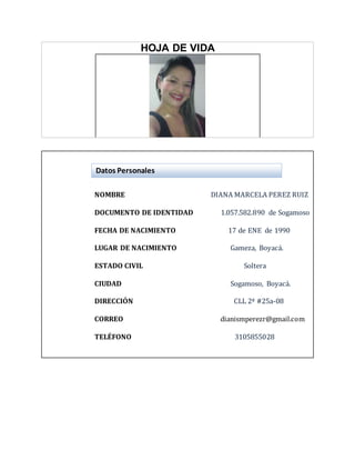 La hoja de vida presenta los datos personales y la trayectoria académica y laboral de Diana Marcela Pérez Ruiz. Se detallan sus estudios primarios y secundarios, así como su formación como tecnóloga en administración turística y hotelera. Se resaltan sus cualidades de liderazgo, creatividad y responsabilidad. Su experiencia laboral incluye cargos como auxiliar administrativa, administradora y recepcionista en diferentes empresas durante periodos de 6 meses a 3 años. Se proporcionan también referencias familiares y personales.