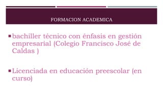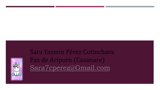 Este documento presenta el currículum de Sara Yasmin Pérez Cotinchara, quien actualmente cursa la licenciatura en educación preescolar. Detalla su formación académica que incluye un bachillerato técnico en gestión empresarial, así como experiencia laboral en cargos de logística, administración y servicio al cliente en diferentes empresas. Además, proporciona referencias familiares y personales de contacto, así como sus pasatiempos favoritos.