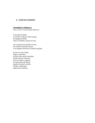 La canción describe a Lima como una ciudad alegre y jaranera donde se celebra la música criolla peruana con el cajón y la guitarra. Destaca la belleza de las limeñas y cómo la marinera, danzada en los barrios del Rímac, ayudó a dar color a la cultura criolla de Lima. El análisis resalta la importancia de valorar la identidad cultural de Lima y el Perú representadas en la música y danzas criollas.