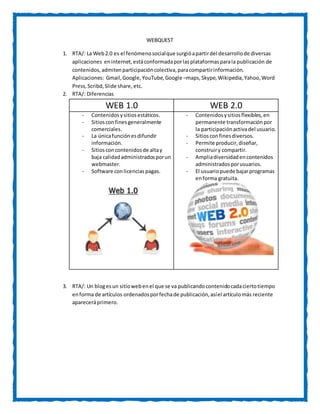 Este documento resume las diferencias entre la Web 1.0 y la Web 2.0, y define qué es un blog. Explica que la Web 2.0 permite la participación colectiva a través de plataformas como YouTube y Wikipedia, mientras que la Web 1.0 tenía contenidos estáticos y sitios comerciales. También señala que la Web 2.0 tiene contenidos administrados por usuarios y software gratuito, a diferencia de la Web 1.0 que tenía licencias pagas. Por último, define un blog como un sitio web donde se publican artículos ordenados por fecha,