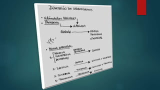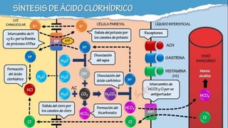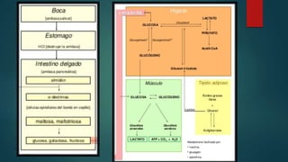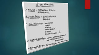 Este documento resume los conceptos clave de la digestión humana. Explica que la digestión comienza en la cavidad oral donde la saliva contiene enzimas como la amilasa que empiezan a descomponer los carbohidratos. Luego, los alimentos pasan al estómago donde se mezclan con ácido clorhídrico y enzimas gástricas como la pepsina. Después, en el intestino delgado, jugos pancreáticos y bilis from el hígado y el páncreas continúan digiriendo los lí