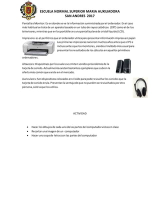 Este documento describe los principales dispositivos de entrada y salida de un computador. Entre los dispositivos de entrada se encuentran el teclado, el ratón, el micrófono, el scanner y la webcam, los cuales permiten introducir datos, comandos y programas en la CPU. Los dispositivos de salida mencionados son el monitor, la impresora, los altavoces y los auriculares, a través de los cuales se muestra e imprime la información procesada. Finalmente, el documento propone algunas actividades para reconocer estas partes del computador