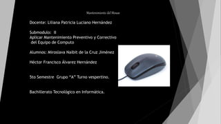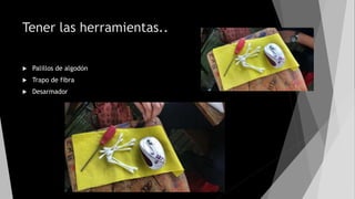 Este documento proporciona instrucciones para realizar el mantenimiento preventivo y correctivo de un mouse, incluyendo desarmarlo con cuidado, limpiar todas sus áreas internas y externas con hisopos y un paño húmedo, y volver a armarlo. Recomienda usar palillos de algodón, trapo de fibra y desarmador, y el procedimiento varía ligeramente dependiendo de si es un mouse óptico o inalámbrico.