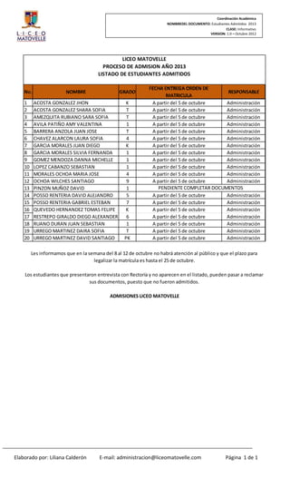 Este documento presenta una lista de 20 estudiantes admitidos en el Liceo Matovelle para el año 2013, incluyendo sus nombres, grados y fechas para entregar la orden de matrícula. También informa que la administración no atenderá público del 8 al 12 de octubre y que el plazo para legalizar la matrícula es hasta el 25 de octubre. Además, indica que los estudiantes que tuvieron entrevista con la rectoría pero no aparecen en la lista pueden reclamar sus documentos, dado que no fueron admitidos