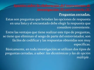 Este documento describe diferentes tipos de preguntas que se pueden incluir en un cuestionario de investigación, incluyendo preguntas cerradas, dicotómicas, de opción múltiple y con escalas de medición. Las preguntas cerradas eliminan el sesgo y son fáciles de codificar, mientras que las preguntas dicotómicas ofrecen solo sí o no y las de opción múltiple dan una gama más amplia de respuestas. Las preguntas de escala miden el grado de acuerdo u otras actitudes usando escalas