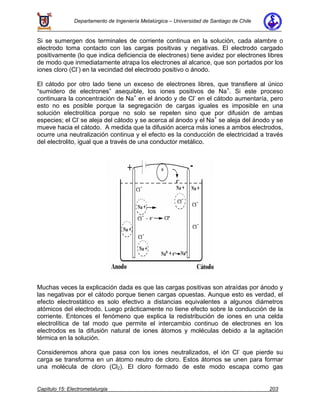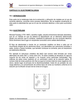 Este documento describe los procesos de electrólisis y electrorefinación de cobre. Explica que la electrólisis involucra reacciones separadas en el cátodo y el ánodo, mediadas por el movimiento de iones a través del electrolito. La electrorefinación se usa para refinar cobre impuro en ánodos a cobre de alta pureza en cátodos, removiendo impurezas como oro y plata en el proceso. El documento también brinda detalles sobre cómo se producen y procesan los ánodos y cátodos de