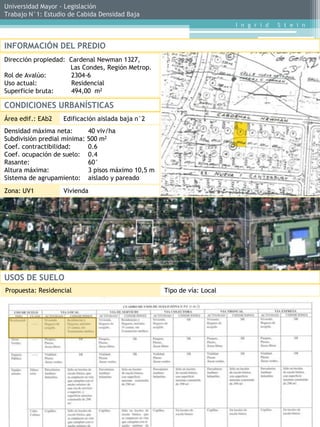 Este documento presenta un estudio de cabida y densidad para un predio ubicado en la comuna de Las Condes. Resume la información del predio, las condiciones urbanísticas, los usos de suelo permitidos, y realiza cálculos para determinar el volumen constructible máximo, la densidad permitida, y los requerimientos de estacionamientos de acuerdo a la normativa. El estudio concluye que se pueden construir dos viviendas de 147,2 m2 cada una con un total de 5 estacionamientos.