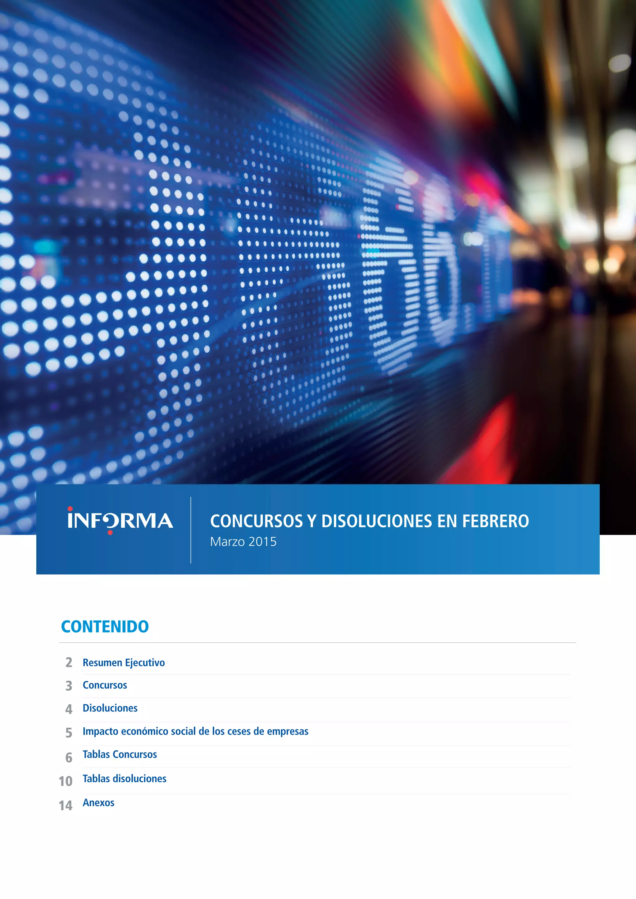 Este documento resume los datos de concursos y disoluciones de empresas en España durante febrero de 2015. Se registraron 579 concursos, una disminución del 14.98% con respecto a febrero de 2014. También hubo 2,634 disoluciones, un 11.52% menos que el año anterior. Los sectores con más concursos fueron construcción, inmobiliarias, comercio e industria, mientras que las comunidades con más fueron Cataluña, Madrid y Comunidad Valenciana.
