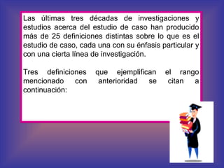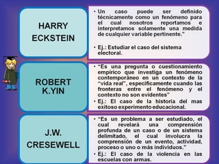 El documento presenta una revisión de las definiciones y tipologías del estudio de casos como método de investigación. Se discuten más de 25 definiciones propuestas por diferentes autores y se clasifican los estudios de casos en descriptivos, explicativos y exploratorios; así como por disciplina, propósito e intervención del investigador. Finalmente, se describen las etapas propuestas para la generación de teorías mediante este método.