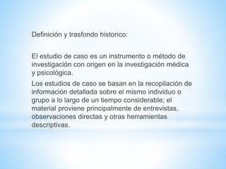 El documento define el estudio de caso como un método de investigación cualitativa que implica la recopilación detallada de información sobre un individuo o grupo a lo largo del tiempo. Los estudios de caso se originaron en la investigación médica y psicológica y se usan comúnmente en ciencias sociales. El documento luego describe los objetivos de los estudios de caso, como producir nuevos conocimientos o confirmar teorías, y proporciona un ejemplo de cómo Chrysler usó estudios de caso para mejorar sus estrategias de ventas y salir de la banc
