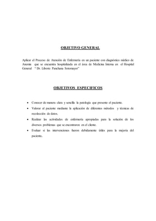 Este documento presenta un estudio de caso sobre la aplicación del proceso de atención de enfermería a un paciente con diagnóstico de anemia. Describe la historia clínica del paciente, los exámenes realizados, el tratamiento recibido y la evolución. Además, explica el proceso de atención de enfermería, que incluye la valoración, diagnóstico, planificación, ejecución y evaluación. Finalmente, presenta los patrones funcionales de salud del paciente.