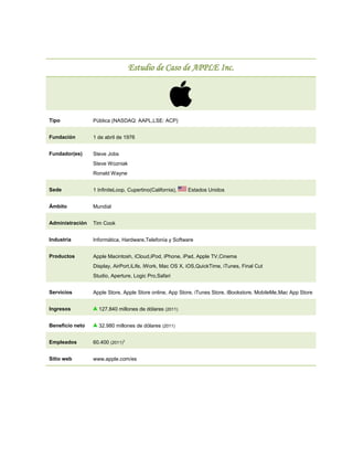 Apple Inc. es una empresa estadounidense fundada en 1976 por Steve Jobs y Steve Wozniak. Diseña y produce hardware como los ordenadores Macintosh, iPod e iPhone, y software como el sistema operativo macOS, iOS, y programas como iTunes. Es líder en la industria de la música digital y continúa innovando en diferentes productos electrónicos.