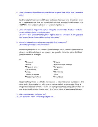 Este documento presenta un resumen de preguntas y respuestas sobre cámaras digitales y elementos de composición de imágenes. Incluye recomendaciones sobre cámaras digitales para capturar imágenes del carnaval de Pasto y preguntas sobre megapíxeles, tamaño de imágenes y elementos principales de composición como encuadre, planos, profundidad de campo y líneas. También describe los diferentes planos fotográficos y su importancia para la proporción de elementos en la toma.