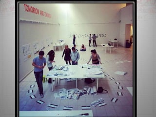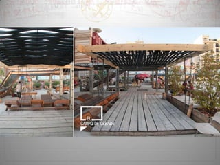El documento describe la evolución del espacio público de la Plaza de la Cebada en Madrid. Originalmente era un mercado al aire libre, pero con el tiempo se construyeron edificios para albergar el mercado de manera cubierta. Más tarde, estos edificios fueron demolidos y el solar resultante se convirtió en "El Campo de la Cebada", un espacio gestionado por los vecinos con actividades culturales. El documento también analiza proyectos relacionados como "La Casa de Bambú" y otros casos de estudio de arquitect