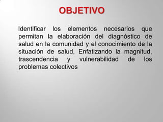 Este documento proporciona información sobre el diagnóstico de salud en la comunidad. Explica que el diagnóstico de salud es el resultado de un estudio epidemiológico que identifica los principales problemas de salud y recursos disponibles para abordarlos. También describe los elementos necesarios para realizar un diagnóstico de salud comunitario como estudiar las características demográficas, factores que afectan la salud y el estado de salud actual. Finalmente, enfatiza la importancia de contar con datos precisos y participación del equipo de