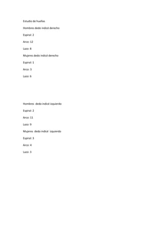 El documento presenta las características de las huellas dactilares de los dedos índices derecho e izquierdo de hombres y mujeres. Los hombres mostraron más espirales, arcos y lazos en ambos dedos índices que las mujeres.