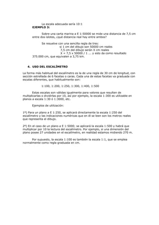 El documento explica el concepto de escala en dibujo técnico y su importancia para representar objetos a un tamaño adecuado al formato. Define la escala como la relación entre la dimensión dibujada y la dimensión real, y distingue entre escalas de ampliación y reducción. Recomienda el uso de escalas normalizadas como 1:2, 1:5, 1:10, etc. Incluye ejemplos prácticos de cálculo de escalas adecuadas para diferentes formatos y usos del escalímetro.