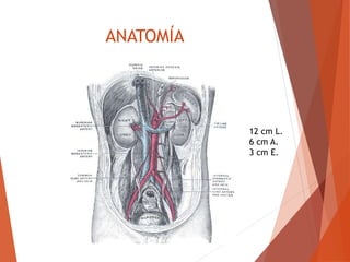 Este documento proporciona información sobre la anatomía, función y pruebas de la función renal. Resume la anatomía del riñón y la nefrona. Explica que las funciones renales incluyen la regulación del volumen corporal, el equilibrio ácido-base y la eliminación de desechos. Describe las pruebas de la función renal como exámenes de orina y sangre. Explica los roles de la creatinina, urea y cistatina en la evaluación de la función renal.