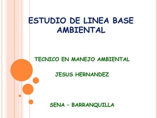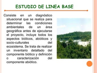 El estudio de línea base consiste en un diagnóstico situacional del área antes del proyecto e incluye aspectos bióticos, abióticos y socio-culturales. Describe las áreas potencialmente afectadas por el proyecto en términos físicos, biológicos y socio-económicos. Su elaboración incluye etapas preparatoria, de campo, análisis de laboratorio y gabinete para caracterizar los recursos y establecer la línea base ambiental del área.