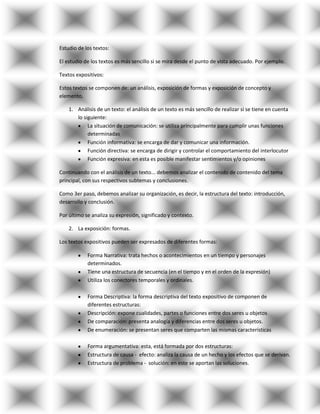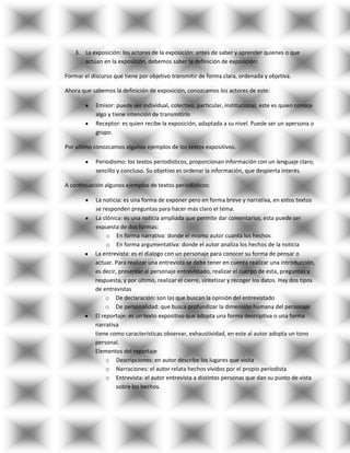 Este documento proporciona una guía detallada para analizar y clasificar diferentes tipos de textos, incluidos textos expositivos, periodísticos, sociales y argumentativos. Explica las características y estructuras de cada tipo de texto, así como ejemplos comunes como noticias, informes, contratos y debates. También cubre conceptos clave como emisores, receptores, funciones del lenguaje y errores comunes en la argumentación.