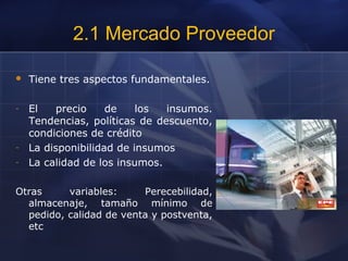 El documento describe los cuatro aspectos clave de un estudio de mercado: 1) el mercado de proveedores, incluyendo precios, disponibilidad y calidad de los insumos; 2) el mercado competidor y la necesidad de definir una estrategia; 3) el mercado de distribuidores y medir los canales de distribución; y 4) el mercado de consumidores, con un enfoque en predecir el comportamiento y segmentar el mercado.
