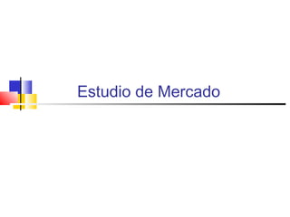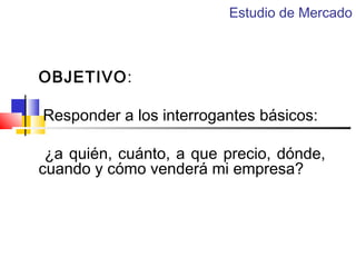 El documento presenta una guía para realizar un estudio de mercado. El objetivo es responder preguntas básicas sobre a quién, cuánto, a qué precio, dónde, cuándo y cómo venderá la empresa. El estudio debe medir la demanda y oferta del producto/servicio, así como precios y formas de comercialización. Se detallan etapas como descripción del producto, segmentación del mercado, análisis de demanda, oferta, mercado potencial, precios y comercialización.
