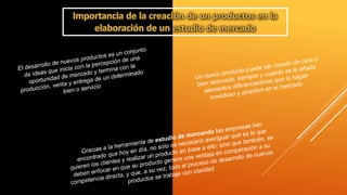 El documento presenta información sobre estudios de mercado. Explica que un estudio de mercado analiza y observa un sector para entrar en él con un bien o servicio. Detalla los componentes de un estudio de mercado como público objetivo, competidores, comportamiento de compra y tendencias. Además, explica conceptos como oferta, demanda, canales de distribución y punto de equilibrio, los cuales son importantes para realizar un estudio de mercado efectivo.