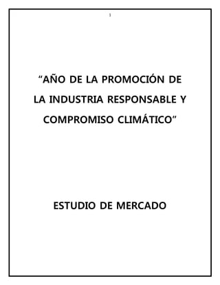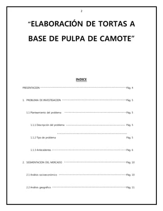 El documento presenta un estudio de mercado sobre la elaboración de tortas a base de pulpa de camote. Describe el problema de investigación, los antecedentes sobre el camote y sus propiedades nutricionales, la segmentación del mercado objetivo y la metodología de la encuesta aplicada, incluyendo el diseño, tabulación de resultados y análisis de la demanda y oferta. El estudio concluye evaluando las variables de marketing de las 7P para el posicionamiento del producto.