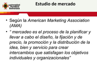 Este documento presenta un resumen de los conceptos clave relacionados con el estudio de mercado. Define mercadeo según la Asociación Americana de Mercadeo y explica que involucra identificar necesidades de los clientes y satisfacerlas de manera rentable. También describe los componentes clave de un análisis de mercado, incluyendo el análisis de la oferta, demanda, competidores y segmentos objetivo.
