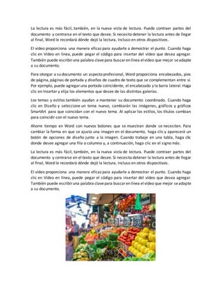 El documento describe las nuevas funciones de Microsoft Word que ayudan a los usuarios a crear documentos profesionales de manera más eficiente. Word ahora incluye nuevas opciones para insertar videos en línea, aplicar temas y estilos para mantener la coherencia, y botones contextuales que facilitan el formato de imágenes y tablas. También presenta una nueva vista de lectura para una experiencia de lectura mejorada.