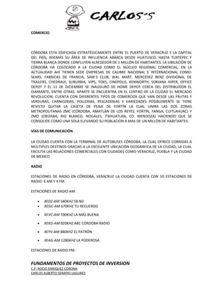 Este documento presenta un estudio de mercado para una nueva empresa llamada Carlos's Fútbol, dedicada a la venta de uniformes de fútbol en Córdoba, México. Analiza el entorno externo e interno, la competencia, el análisis FODA y el mercado potencial. El mercado objetivo son los más de 520 equipos de las 7 ligas de fútbol en Córdoba, con aproximadamente 10,400 jugadores potenciales. La empresa ofrecerá uniformes personalizables a un precio competitivo para captar client
