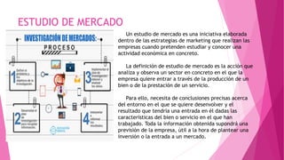 Este documento presenta una introducción al estudio de mercado. Explica que un estudio de mercado analiza un sector específico para determinar las oportunidades y riesgos de entrar en ese mercado con un nuevo producto o servicio. También describe las fuentes de información primaria y secundaria que se pueden utilizar y diferentes tipos de productos.