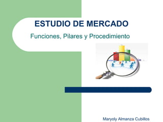 Este documento describe las funciones, pilares y procedimiento de un estudio de mercado. Explica que un estudio de mercado describe lo que está sucediendo en el mercado, evalúa productos, ventas y competencia, y predice tendencias futuras. Además, señala que según Kotler, el marketing se basa en cuatro pilares: orientación al cliente, definición del mercado objetivo, coordinación de funciones de marketing, y rentabilidad. Finalmente, detalla un procedimiento de 7 pasos para realizar estudios de mercado, que incluye definir el problema