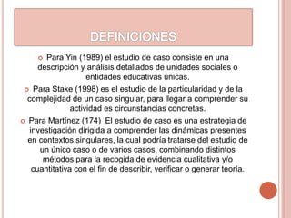 El estudio de caso consiste en el análisis detallado de una unidad social o entidad educativa única, centrándose en su particularidad y complejidad para comprenderla en su contexto. Puede tratarse del estudio de un solo caso o de varios casos combinando métodos cualitativos y/o cuantitativos para describir, verificar o generar teoría. El propósito es alcanzar la mayor comprensión del caso en sí mismo sin generalizar.