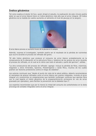 Un estudio encontró que reemplazar el arroz blanco con arroz integral u otros productos integrales podría reducir en hasta un 35% el riesgo de diabetes tipo 2. El arroz blanco causa mayores aumentos en los niveles de glucosa en la sangre que el arroz integral debido a su mayor índice glicémico y pérdida de nutrientes durante el proceso de refinado. Los investigadores recomiendan incluir más granos integrales como el arroz integral en la dieta para prevenir la diabetes.