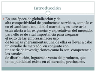 El documento presenta información sobre el estudio de mercado y conceptos relacionados como mercado, tipos de mercado, estrategias de mercado, características de mercado, comercialización, venta y recomendaciones para entrar a un nuevo mercado. Define mercado como el área donde compradores y vendedores intercambian productos y los precios tienden a unificarse. Explica los orígenes del mercado, tipos como mayorista y minorista, estrategias para mercados amplios, y la importancia de entender las dinámicas del mercado al que