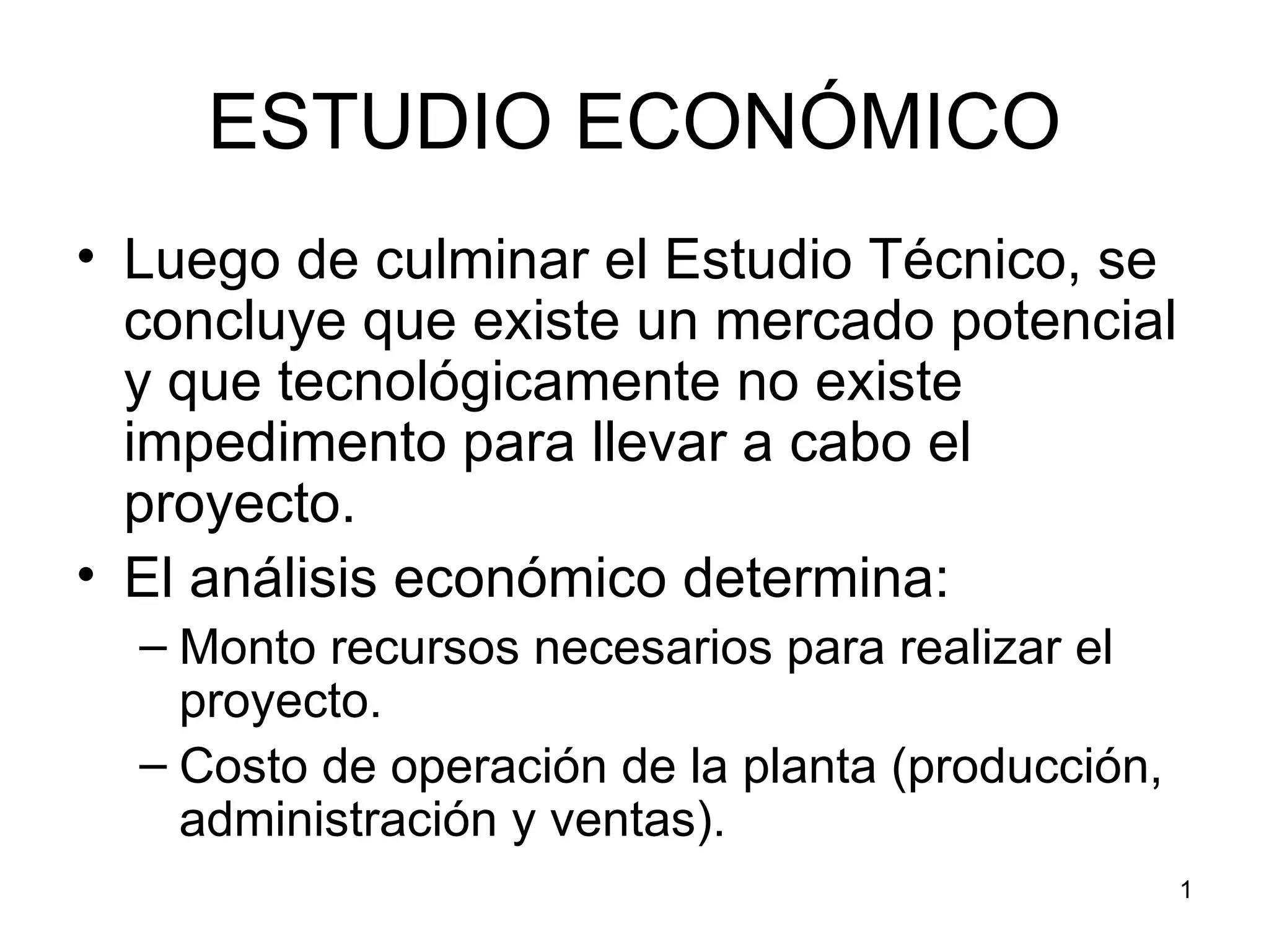 El documento presenta un análisis económico de un proyecto que incluye la determinación de costos de producción, administración y ventas, así como la inversión inicial requerida. Se calcula el punto de equilibrio y se proyectan estados de resultados y flujos de efectivo a 5 años para evaluar la rentabilidad del proyecto. Finalmente, se discuten opciones para financiar la inversión inicial a través de préstamos.