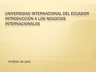 Este documento presenta un análisis de país sobre España para evaluar las oportunidades de exportar barras de cereal con frutas tropicales deshidratadas desde Ecuador. Describe los factores clave como la disponibilidad de tierra y mano de obra para la producción, así como la demanda creciente en España por alimentos saludables y preparados. Incluye un diamante de Porter para evaluar la ventaja competitiva y un análisis FODA sobre las condiciones del mercado y la estrategia de entrada.