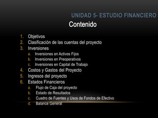 El documento describe los componentes clave de un estudio financiero de un proyecto, incluyendo inversiones, costos, gastos e ingresos. El estudio financiero sistematiza la información económica de otros estudios para calcular cuentas financieras y definir la estructura financiera del proyecto. Se clasifican y ordenan valores monetarios relacionados con inversiones, costos, gastos e ingresos para obtener una base para la evaluación financiera del proyecto.