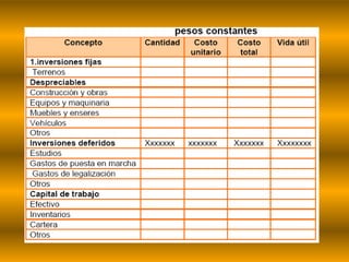 Este documento describe los componentes de un estudio financiero para un proyecto. Explica los tipos de inversiones como inversión fija, diferida y capital de trabajo. También describe los costos de producción y gastos, clasificándolos en variables, fijos, de fabricación, administrativos, de ventas, financieros y generales. Finalmente, menciona los ingresos y estados financieros estáticos y dinámicos para evaluar la viabilidad de un proyecto.