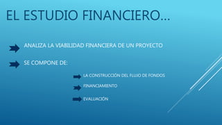Este documento resume los principales componentes de un estudio financiero de viabilidad de un proyecto de inversión, incluyendo la construcción del flujo de fondos, el financiamiento, y la evaluación financiera. El flujo de fondos proyecta los ingresos, costos e inversiones a lo largo del tiempo del proyecto. La evaluación incluye métodos como la tasa de retorno promedio, período de recuperación, punto de equilibrio, valor actual neto y tasa interna de retorno.