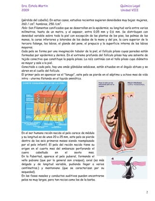 Este documento presenta una introducción al estudio forense del pelo. Describe la morfología del pelo humano, incluyendo la estructura del folículo piloso, la cutícula, la corteza y la médula. También discute el desarrollo del pelo durante el embarazo, la infancia y la pubertad, así como las características del pelo según la edad y el sexo. El documento proporciona información sobre el análisis microscópico del pelo y sus usos en investigaciones forenses.