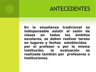 El documento describe el estudio independiente como un proceso centrado en el alumno donde asume la responsabilidad de su propio aprendizaje a través de la autoevaluación. En contraste con la enseñanza tradicional centrada en el maestro, el estudio independiente permite que el alumno sea consciente de sus errores y se responsabilice de su progreso. Para que sea efectivo, requiere materiales significativos, conocimientos previos del alumno y su motivación. También señala que incorporar las nuevas tecnologías puede ayudar a