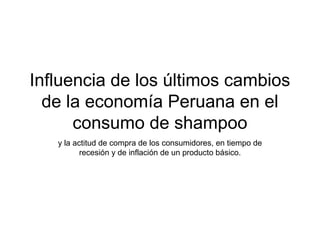 El documento analiza la influencia de los cambios económicos en el Perú sobre el consumo de shampoo, identificando que la mayoría de las mujeres utiliza este producto, siendo la calidad un factor determinante en su elección. A través de una encuesta a 100 usuarios en Lima, se identifican hábitos de compra y preferencias en características del shampoo. Las conclusiones enfatizan la evolución de los champús de productos de higiene a elementos de belleza y la saturación del mercado, donde el precio y las promociones influyen en la decisión de compra.