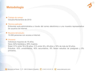 El documento presenta los resultados de una encuesta sobre el uso de Internet móvil realizada a 10.006 personas en España. Los principales hallazgos son: el acceso a Internet móvil ha aumentado un 15% respecto al año anterior, siendo el factor económico la principal barrera; el 64% de los usuarios son intensivos y el acceso a redes sociales ha crecido desde el 18% al 43% en un año; la lectura de correo electrónico es el uso principal aunque crece la navegación y el acceso a redes sociales con fines más lúdicos.