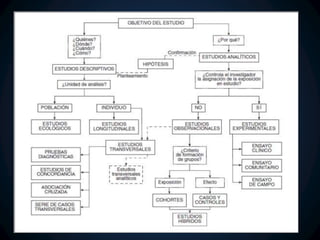 Este documento describe los estudios retrospectivos de casos y controles, los cuales comparan grupos de individuos enfermos (casos) con grupos sanos (controles) para identificar factores de riesgo asociados a una enfermedad. Explica que este tipo de estudios se basan en información ya recolectada de forma rápida y económica, pero no pueden establecer relaciones de causalidad. También resalta ventajas como su rapidez, bajo costo y capacidad de estudiar múltiples factores, así como limitaciones respecto a no invol