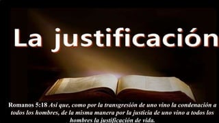 El documento discute la justificación de Dios hacia los pecadores. Explica que Dios justifica a aquellos que reconocen su condición pecaminosa y se vuelven a Él mediante la fe, no por sus obras. También señala que la justificación es posible solo a través de la obra redentora de Cristo, quien satisfizo las demandas de la justicia de Dios en favor de los creyentes.