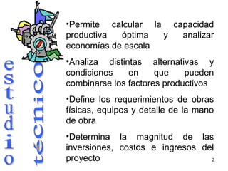 Este documento resume los conceptos clave de tamaño de proyecto, localización e ingeniería de proyectos. El tamaño de un proyecto se refiere a su capacidad de producción y depende de factores como el tamaño del mercado, costos y disponibilidad de insumos. La localización analiza las mejores ubicaciones para un proyecto considerando costos de transporte e infraestructura. La ingeniería busca una función de producción óptima mediante la combinación eficiente de factores productivos como maquinaria, equipos e in