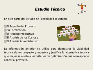 El módulo cuatro del estudio técnico se centra en evaluar la viabilidad técnica de un proyecto a través del análisis del tamaño, localización, proceso productivo, costos, y aspectos administrativos. Se detallan objetivos de estudio, justificación del tamaño del proyecto, ingeniería del proceso productivo, organización para la ejecución y operación, y un cronograma de actividades. Finalmente, se abordan los costos de inversión y operación, así como los factores socioeconómicos que influyen en la localización del proyecto.